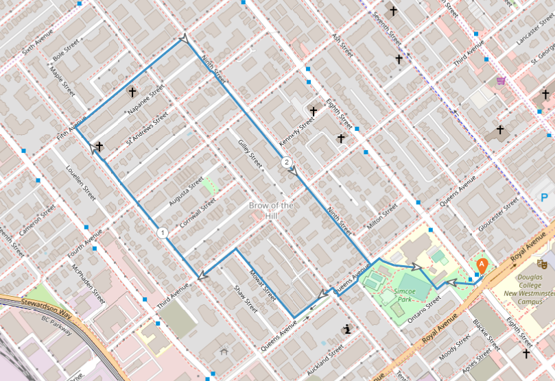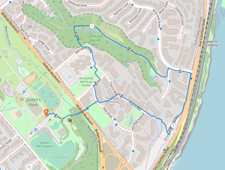 The walk will begin at Queen's Park Arena and will continue into the Victoria Hill neighbourhood. The walking route will follow the McBride Pedestrian Overpass, and up onto Ross Drive and Blackberry Drive before entering the Glenbrook Ravine trail. After going down Glenbrook Ravine, the walk will follow East Columbia Street and up onto Francis Way, before returning to Queen's Park.