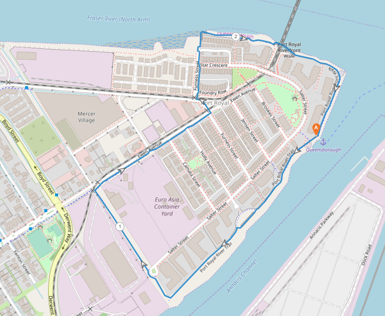 This walk begins at the Queensborough QtoQ Komagata Maru ferry dock and follows the Komagata Maru Perimeter Trail before heading north onto the Stanley Street Greenway. It continues east along Ewen Avenue, then north on Furness Street before following the Queensborough Perimeter Trail back to the ferry dock.