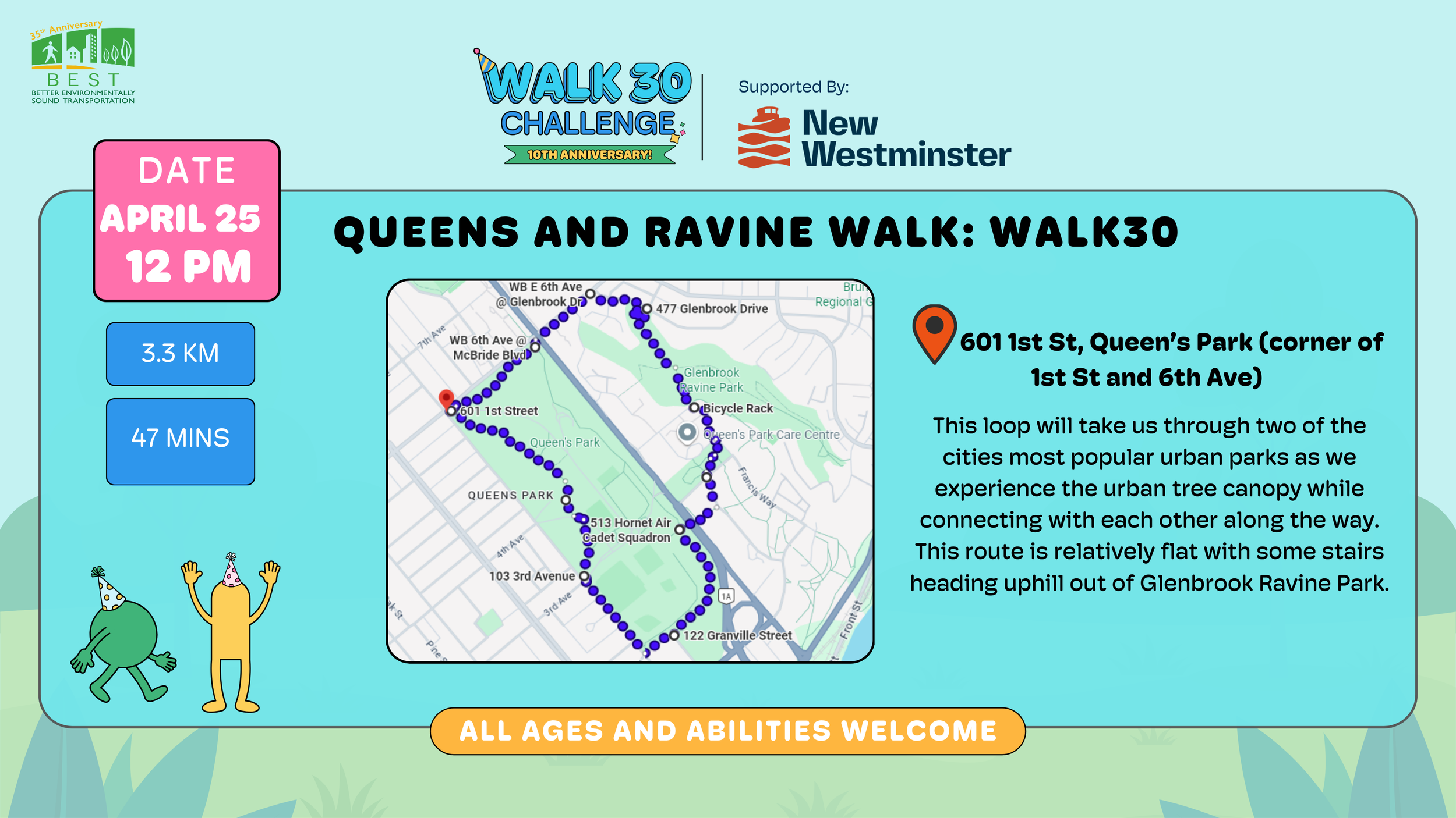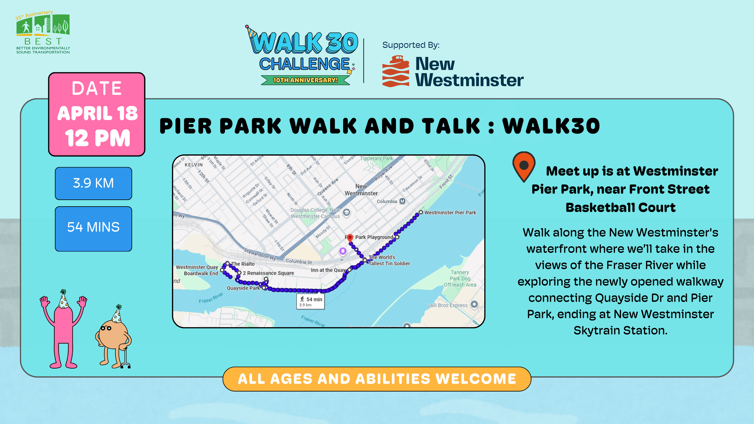 WALK30 continues with BEST and the City of New Westminster so join us for a casual 3.9km (54 mins) accessible walk along the New Westminster's waterfront. Starting at Westminster Pier Park (by the basketball courts) we’ll take in the views of the Fraser River while exploring the newly opened walkway connecting Quayside Dr and Pier Park, ending at New Westminster Skytrain Station.