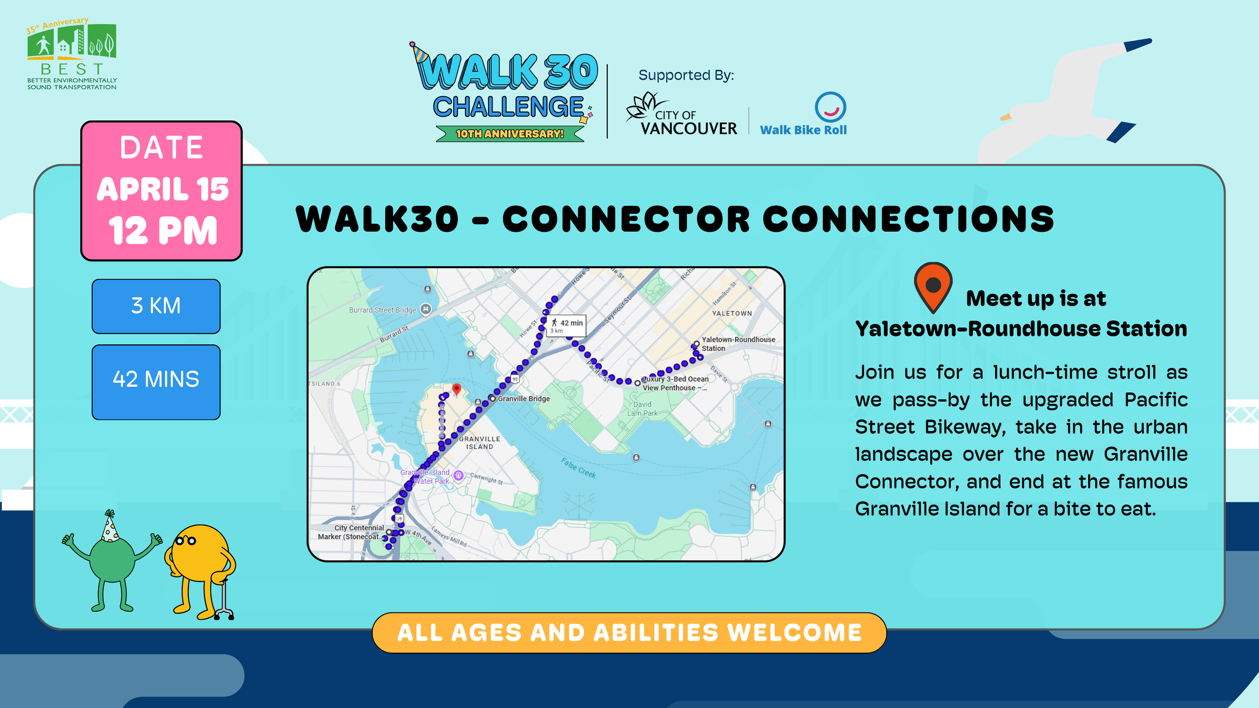 Keep WALK30 moving and join us for a relaxing walk as we experience the improved walking and cycling connections across the Granville Bridge together. Starting at Yaletown-Roundhouse SkyTrain Station at 12:00pm, we’ll follow the new Pacific Street Bikeway as we walk up and over the Granville Connector, taking in the urban landscapes and mountain views along the way all while logging some strong walking minutes for WALK30!